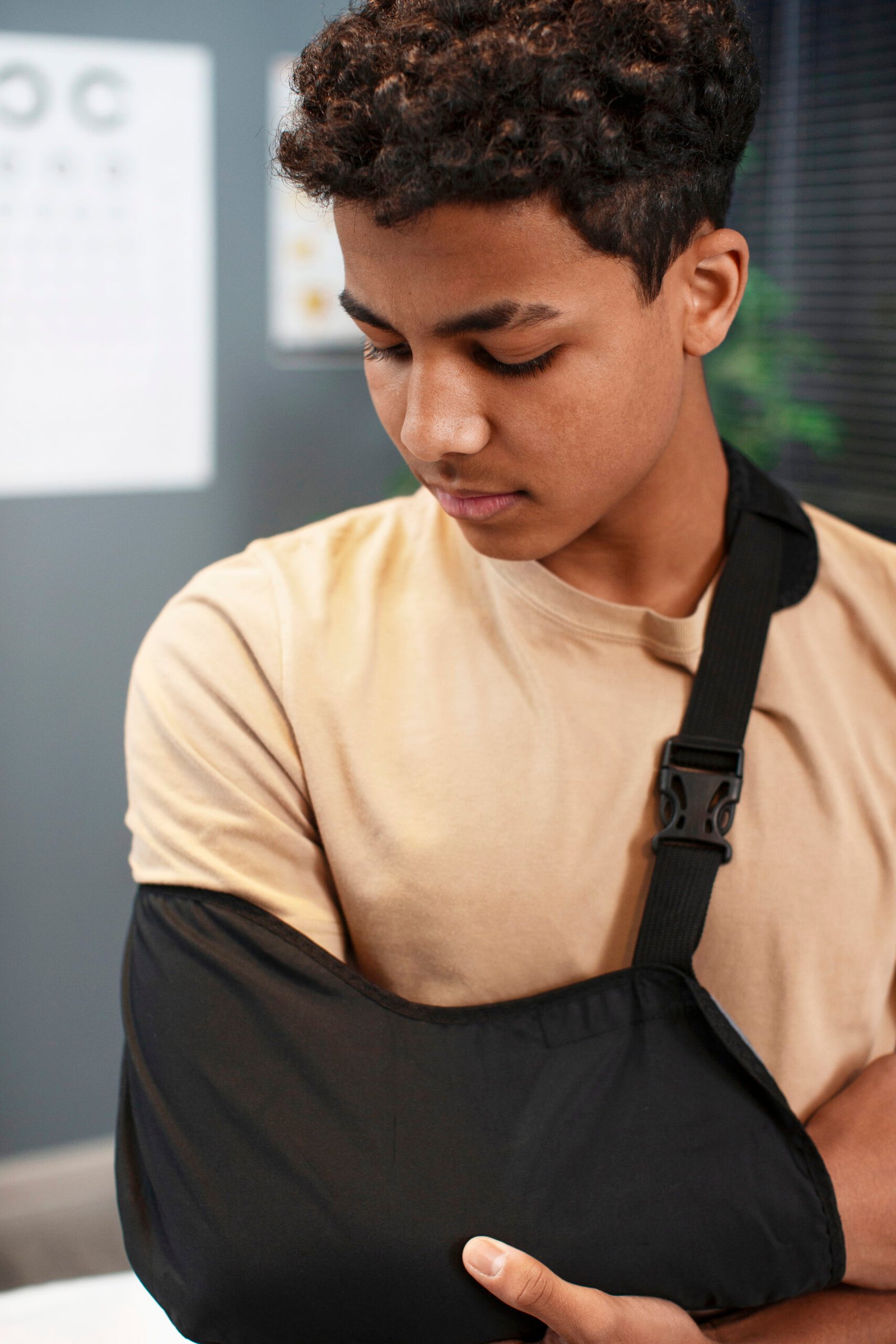 - Je draagt een mitella of sling om je schouder te beschermen.